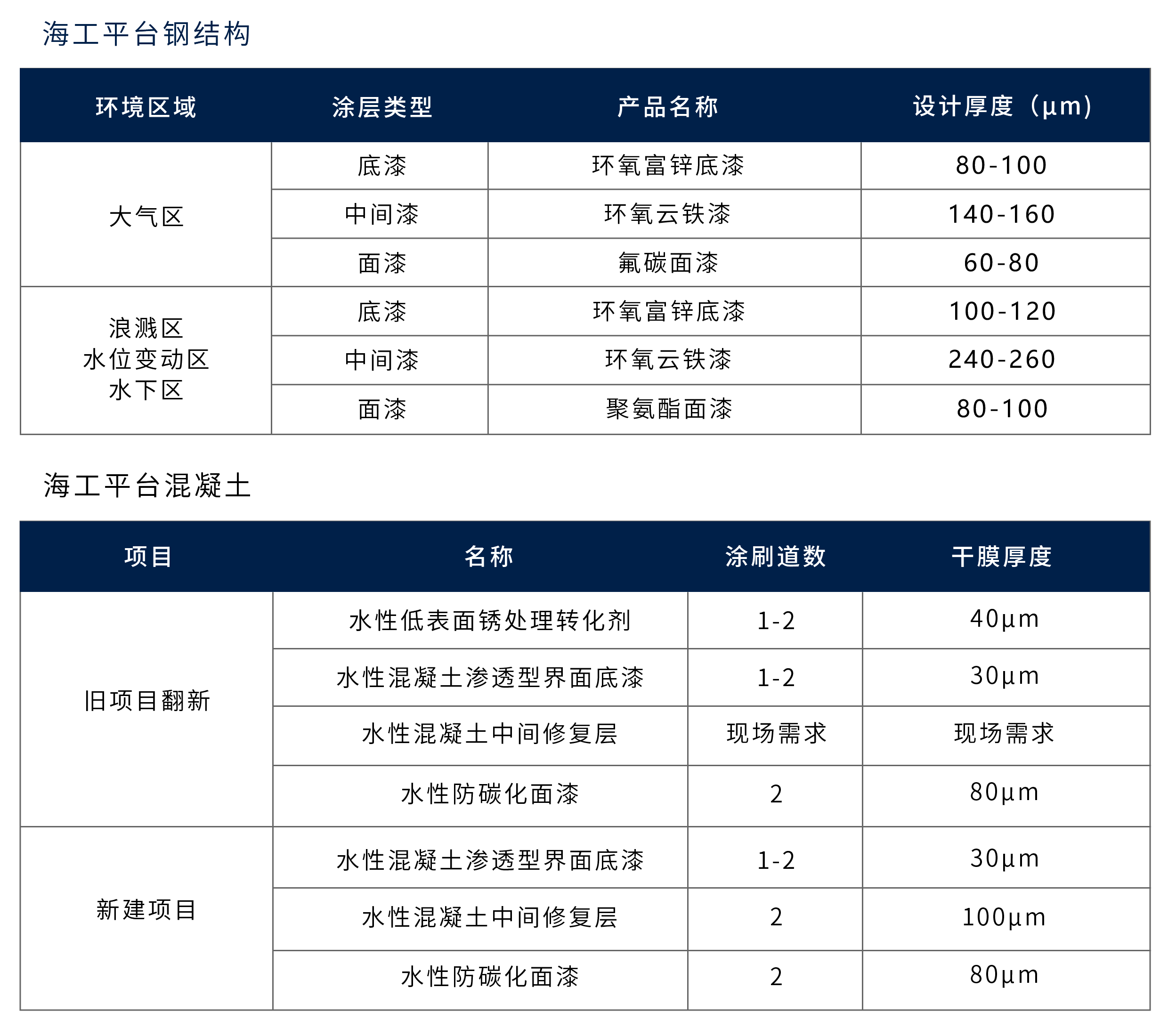 优异的防护性能,腐蚀涂料有优异的附着力、良好的力学性能,耐海水冲刷、耐磨性、耐趾撞性好。耐盐水、耐盐雾、耐化学品性能。外部的面漆具有优异的耐紫外线照射,保光保色性好。能够有效的保护C5M环境下海工平台和海洋工程设施设备。产品符合IMO规定,通过产品的多样性、操作的便捷性、施工的安全性满足各海域对腐蚀防护和环境保护的要求。